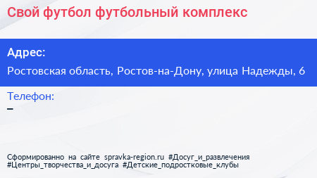 Свой футбол, футбольный комплекс по адресу Ростовская область, Ростов-на-Дону, улица Надежды, 6 в дальнейшем Организация, размещена в следующих категориях: