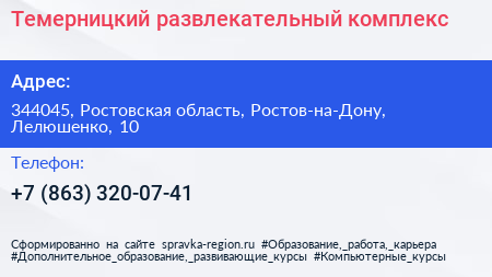 Темерницкий, развлекательный комплекс по адресу 344045, Ростовская область, Ростов-на-Дону, Лелюшенко, 10 в дальнейшем Организация, размещена в следующих категориях: