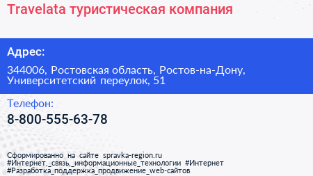 Travelata, туристическая компания по адресу 344006, Ростовская область, Ростов-на-Дону, Университетский переулок, 51 в дальнейшем Организация, размещена в следующих категориях: