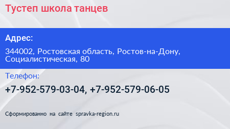 Тустеп, школа танцев по адресу 344002, Ростовская область, Ростов-на-Дону, Социалистическая, 80 в дальнейшем Организация, размещена в следующих категориях: