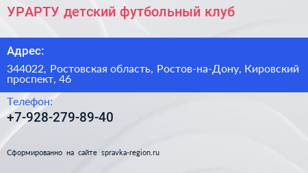 УРАРТУ, детский футбольный клуб по адресу 344022, Ростовская область, Ростов-на-Дону, Кировский проспект, 46 в дальнейшем Организация, размещена в следующих категориях: