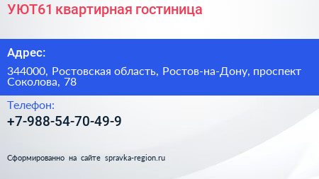 УЮТ61, квартирная гостиница по адресу 344000, Ростовская область, Ростов-на-Дону, проспект Соколова, 78 в дальнейшем Организация, размещена в следующих категориях: