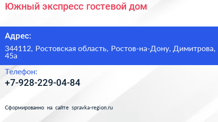 Южный экспресс, гостевой дом по адресу 344112, Ростовская область, Ростов-на-Дону, Димитрова, 45а в дальнейшем Организация, размещена в следующих категориях: