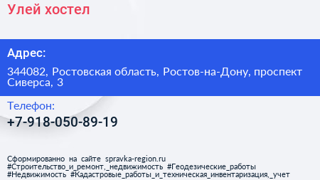 Улей, хостел по адресу 344082, Ростовская область, Ростов-на-Дону, проспект Сиверса, 3 в дальнейшем Организация, размещена в следующих категориях: