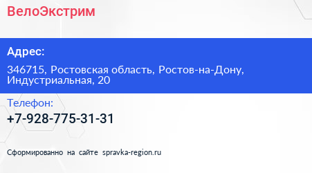 ВелоЭкстрим по адресу 346715, Ростовская область, Ростов-на-Дону, Индустриальная, 20 в дальнейшем Организация, размещена в следующих категориях: