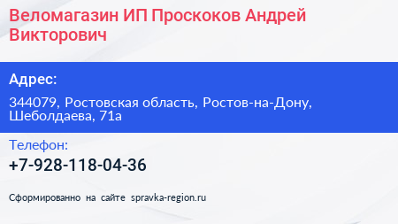 Веломагазин, ИП Проскоков Андрей Викторович по адресу 344079, Ростовская область, Ростов-на-Дону, Шеболдаева, 71а в дальнейшем Организация, размещена в следующих категориях: