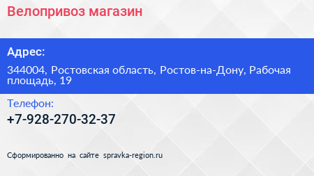 Велопривоз, магазин по адресу 344004, Ростовская область, Ростов-на-Дону, Рабочая площадь, 19 в дальнейшем Организация, размещена в следующих категориях: