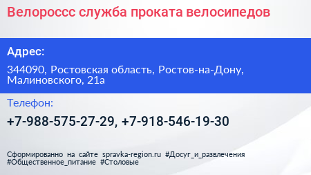 Велороссс, служба проката велосипедов по адресу 344090, Ростовская область, Ростов-на-Дону, Малиновского, 21а в дальнейшем Организация, размещена в следующих категориях:
