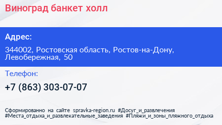 Виноград, банкет-холл по адресу 344002, Ростовская область, Ростов-на-Дону, Левобережная, 50 в дальнейшем Организация, размещена в следующих категориях: