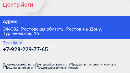 Центр йоги по адресу 344082, Ростовская область, Ростов-на-Дону, Тургеневская, 16 в дальнейшем Организация, размещена в следующих категориях: