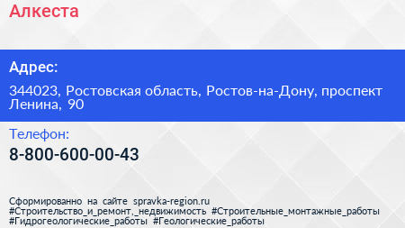 Алкеста по адресу 344023, Ростовская область, Ростов-на-Дону, проспект Ленина, 90 в дальнейшем Организация, размещена в следующих категориях:
