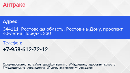 Антракс по адресу 344111, Ростовская область, Ростов-на-Дону, проспект 40-летия Победы, 330 в дальнейшем Организация, размещена в следующих категориях:
