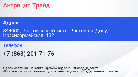 Антрацит Трейд по адресу 344002, Ростовская область, Ростов-на-Дону, Красноармейская, 132 в дальнейшем Организация, размещена в следующих категориях: