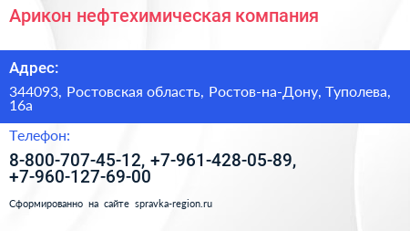 Арикон, нефтехимическая компания по адресу 344093, Ростовская область, Ростов-на-Дону, Туполева, 16а в дальнейшем Организация, размещена в следующих категориях: