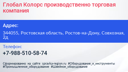 Глобал Колорс, производственно-торговая компания по адресу 344055, Ростовская область, Ростов-на-Дону, Совхозная, 2д в дальнейшем Организация, размещена в следующих категориях: