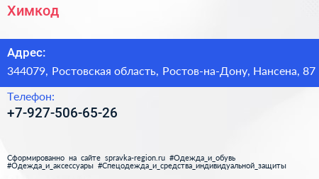 Химкод по адресу 344079, Ростовская область, Ростов-на-Дону, Нансена, 87 в дальнейшем Организация, размещена в следующих категориях: