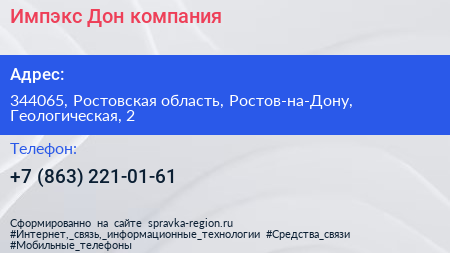 Импэкс-Дон, компания по адресу 344065, Ростовская область, Ростов-на-Дону, Геологическая, 2 в дальнейшем Организация, размещена в следующих категориях: