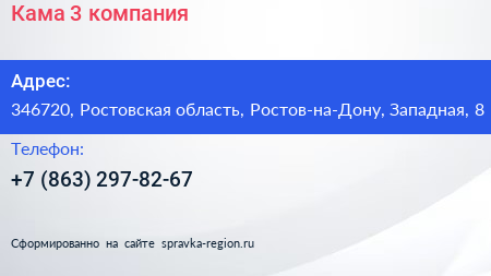 Кама-3, компания по адресу 346720, Ростовская область, Ростов-на-Дону, Западная, 8 в дальнейшем Организация, размещена в следующих категориях: