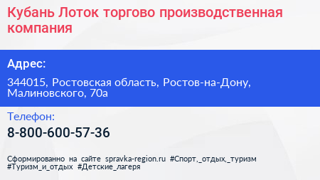 Кубань-Лоток, торгово-производственная компания по адресу 344015, Ростовская область, Ростов-на-Дону, Малиновского, 70а в дальнейшем Организация, размещена в следующих категориях: