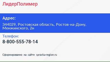 ЛидерПолимер по адресу 344029, Ростовская область, Ростов-на-Дону, Менжинского, 2н в дальнейшем Организация, размещена в следующих категориях: