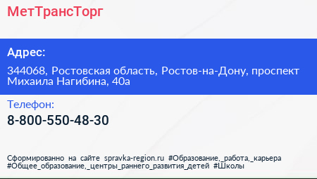 МетТрансТорг по адресу 344068, Ростовская область, Ростов-на-Дону, проспект Михаила Нагибина, 40а в дальнейшем Организация, размещена в следующих категориях: