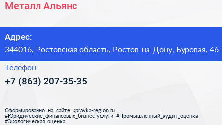 Металл-Альянс по адресу 344016, Ростовская область, Ростов-на-Дону, Буровая, 46 в дальнейшем Организация, размещена в следующих категориях: