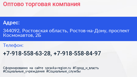 Оптово-торговая компания по адресу 344092, Ростовская область, Ростов-на-Дону, проспект Космонавтов, 2Б в дальнейшем Организация, размещена в следующих категориях: