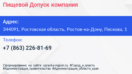 Пищевой Допуск, компания по адресу 344091, Ростовская область, Ростов-на-Дону, Пескова, 1 в дальнейшем Организация, размещена в следующих категориях: