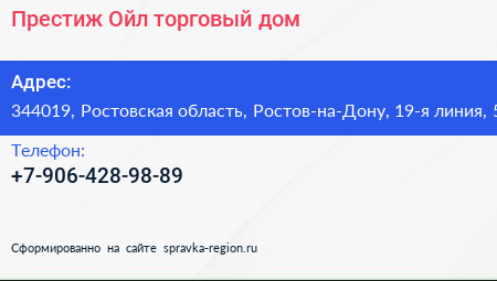 Престиж Ойл, торговый дом по адресу 344019, Ростовская область, Ростов-на-Дону, 19-я линия, 5 в дальнейшем Организация, размещена в следующих категориях: