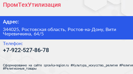 ПромТехУтилизация по адресу 344025, Ростовская область, Ростов-на-Дону, Вити Черевичкина, 64/5 в дальнейшем Организация, размещена в следующих категориях: