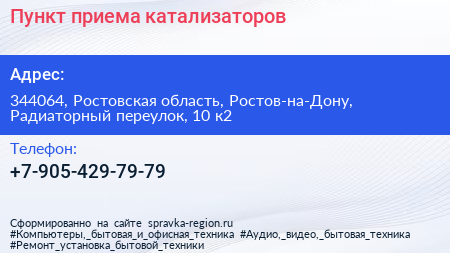 Пункт приема катализаторов по адресу 344064, Ростовская область, Ростов-на-Дону, Радиаторный переулок, 10 к2 в дальнейшем Организация, размещена в следующих категориях: