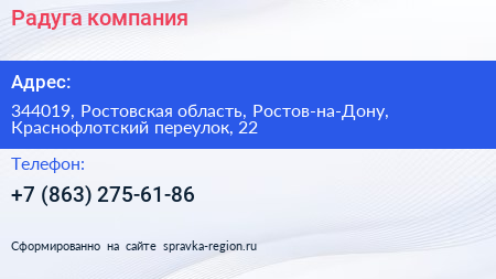 Радуга, компания по адресу 344019, Ростовская область, Ростов-на-Дону, Краснофлотский переулок, 22 в дальнейшем Организация, размещена в следующих категориях: