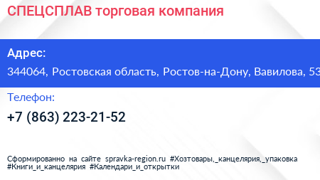СПЕЦСПЛАВ, торговая компания по адресу 344064, Ростовская область, Ростов-на-Дону, Вавилова, 53 в дальнейшем Организация, размещена в следующих категориях: