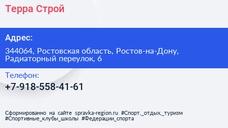 Терра-Строй по адресу 344064, Ростовская область, Ростов-на-Дону, Радиаторный переулок, 6 в дальнейшем Организация, размещена в следующих категориях: