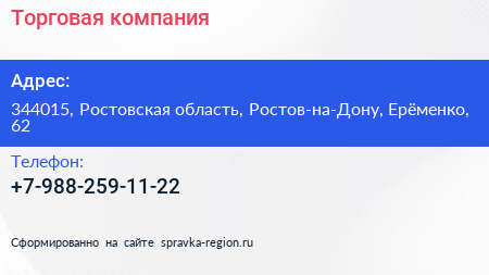 Торговая компания по адресу 344015, Ростовская область, Ростов-на-Дону, Ерёменко, 62 в дальнейшем Организация, размещена в следующих категориях: