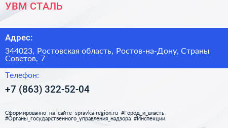 УВМ-СТАЛЬ по адресу 344023, Ростовская область, Ростов-на-Дону, Страны Советов, 7 в дальнейшем Организация, размещена в следующих категориях: