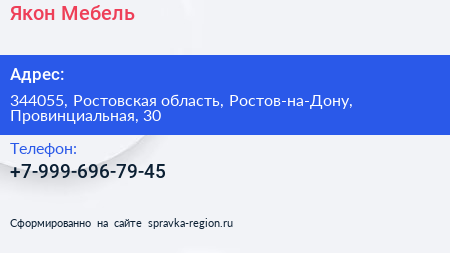 Якон Мебель по адресу 344055, Ростовская область, Ростов-на-Дону, Провинциальная, 30 в дальнейшем Организация, размещена в следующих категориях:
