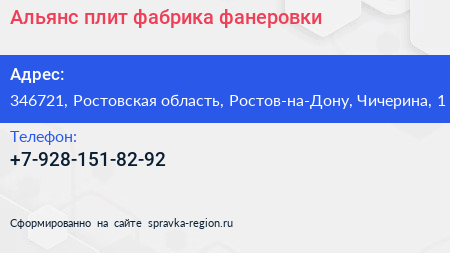 Альянс плит, фабрика фанеровки по адресу 346721, Ростовская область, Ростов-на-Дону, Чичерина, 1 в дальнейшем Организация, размещена в следующих категориях: