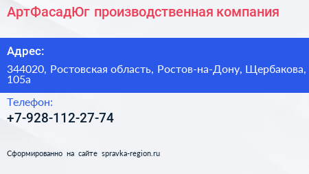 АртФасадЮг, производственная компания по адресу 344020, Ростовская область, Ростов-на-Дону, Щербакова, 105а в дальнейшем Организация, размещена в следующих категориях: