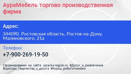 АураМебель, торгово-производственная фирма по адресу 344090, Ростовская область, Ростов-на-Дону, Малиновского, 21а в дальнейшем Организация, размещена в следующих категориях: