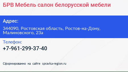 БРВ-Мебель, салон белорусской мебели по адресу 344090, Ростовская область, Ростов-на-Дону, Малиновского, 23а в дальнейшем Организация, размещена в следующих категориях: