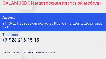 CALAMUSDON, мастерская плетеной мебели по адресу 344041, Ростовская область, Ростов-на-Дону, Доватора, 67а в дальнейшем Организация, размещена в следующих категориях: