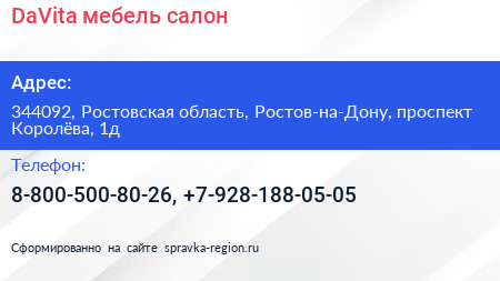 DaVita-мебель, салон по адресу 344092, Ростовская область, Ростов-на-Дону, проспект Королёва, 1д в дальнейшем Организация, размещена в следующих категориях: