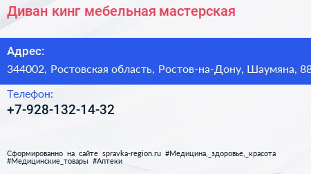 Диван кинг, мебельная мастерская по адресу 344002, Ростовская область, Ростов-на-Дону, Шаумяна, 88 в дальнейшем Организация, размещена в следующих категориях: