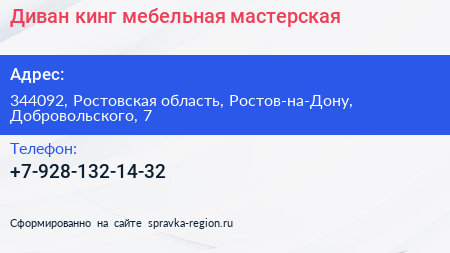 Диван кинг, мебельная мастерская по адресу 344092, Ростовская область, Ростов-на-Дону, Добровольского, 7 в дальнейшем Организация, размещена в следующих категориях: