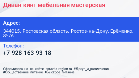 Диван кинг, мебельная мастерская по адресу 344015, Ростовская область, Ростов-на-Дону, Ерёменко, 85/6 в дальнейшем Организация, размещена в следующих категориях: