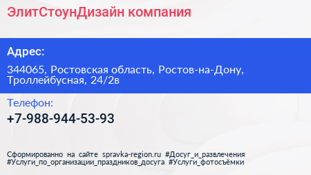 ЭлитСтоунДизайн, компания по адресу 344065, Ростовская область, Ростов-на-Дону, Троллейбусная, 24/2в в дальнейшем Организация, размещена в следующих категориях: