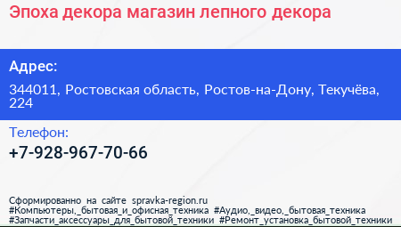 Эпоха декора, магазин лепного декора по адресу 344011, Ростовская область, Ростов-на-Дону, Текучёва, 224 в дальнейшем Организация, размещена в следующих категориях: