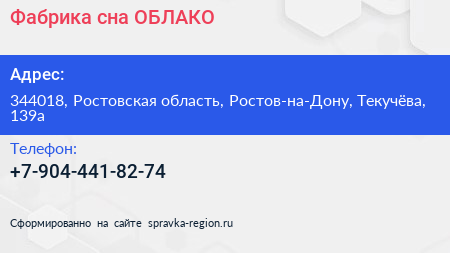 Фабрика сна ОБЛАКО по адресу 344018, Ростовская область, Ростов-на-Дону, Текучёва, 139а в дальнейшем Организация, размещена в следующих категориях:
