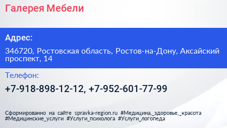 Галерея Мебели по адресу 346720, Ростовская область, Ростов-на-Дону, Аксайский проспект, 14 в дальнейшем Организация, размещена в следующих категориях: